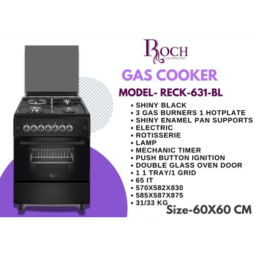 Roch RECK-631-BL 60 × 60 cm Cooker — 3 Gas Burners + 1 Electric Hot Plate with Electric Oven & Rotisserie