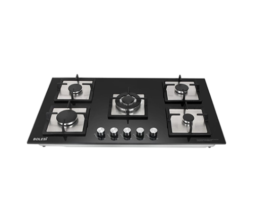 Bolesi HB-59002 5-Burner Built-In Gas Hob with Black Toughened Glass, Auto Ignition, and Flame Failure Safety